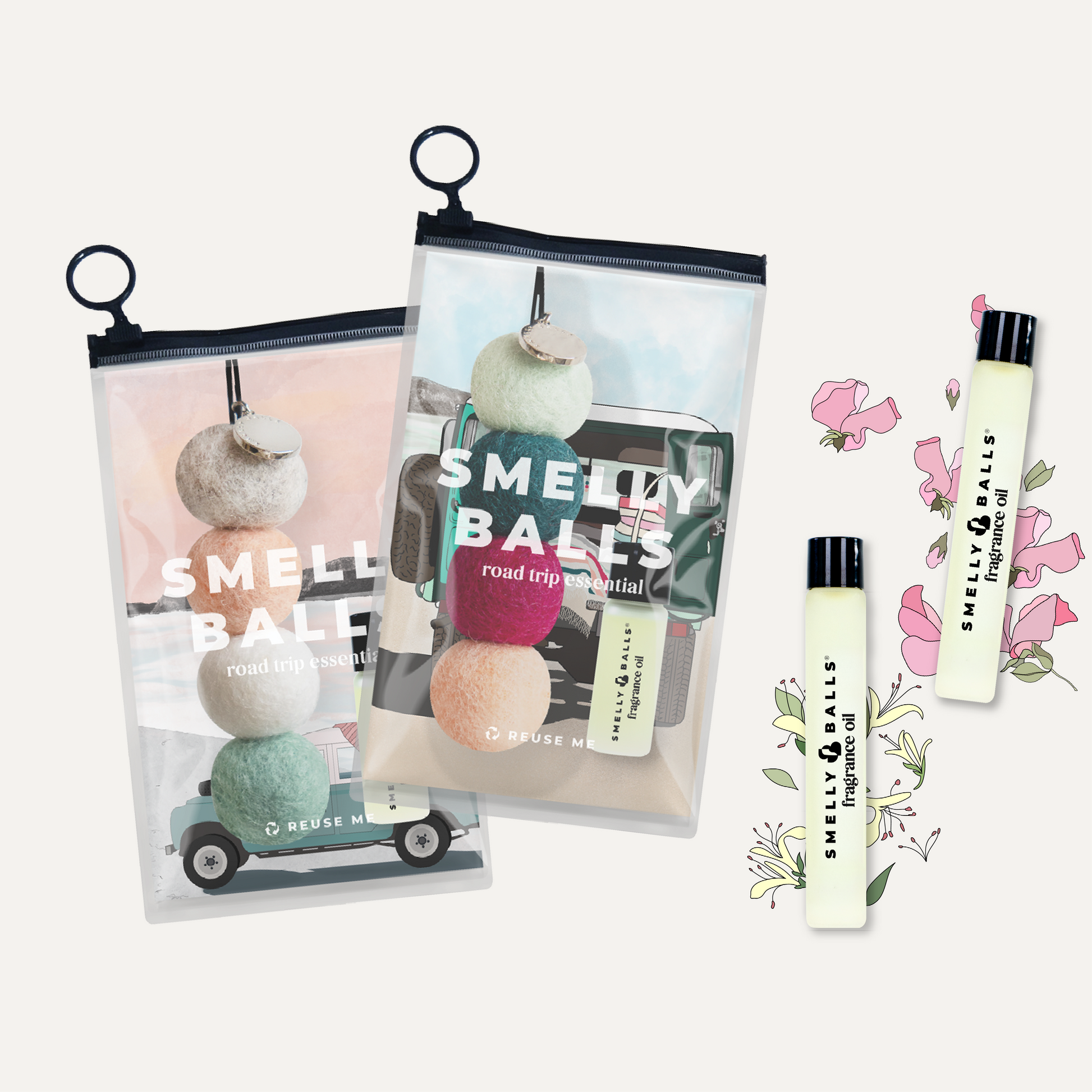 - Roadie with Honeysuckle Fragrance Set: A must-have for every road tripper, these balls capture the essence of sunny summer adventures. This set includes four unscented felt balls and Honeysuckle fragrance oil, which combines fruity, sweet floral notes with mandarin and pine - creating a refreshing, comforting scent for the road ahead.